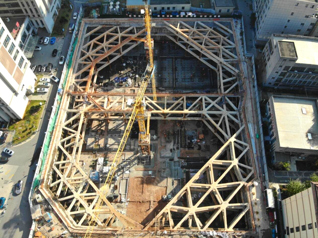 創(chuàng)新采用“旋挖樁+三層混凝土內(nèi)支撐”的復(fù)合支護(hù)體系。基坑平面尺寸達(dá)105.2米×81.9米,深度13.3—15.05米,設(shè)置支護(hù)樁279根、鋼立柱54根及三層混凝土內(nèi)支撐。針對雜填土區(qū)域富含地下水的情況,項目在支護(hù)樁間增設(shè)214根高壓旋噴樁,構(gòu)筑起一道可靠的截水帷幕,有效防止了基坑邊水土流失,保障了基坑穩(wěn)定與周邊建筑物安全。