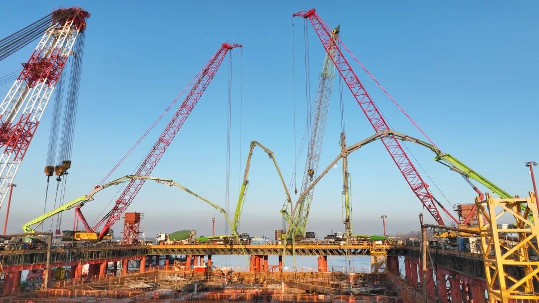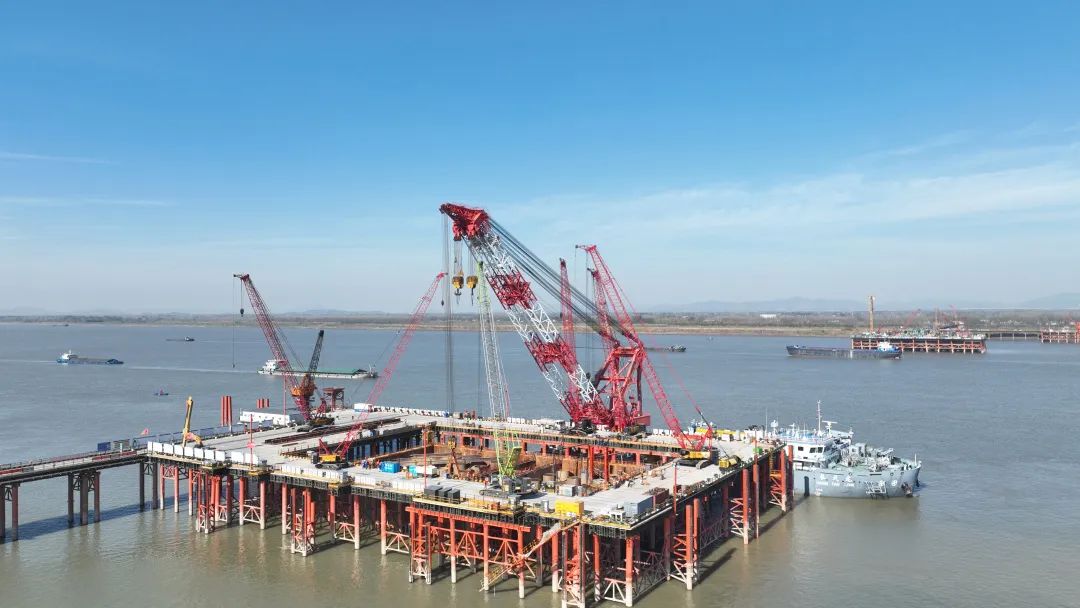 據(jù)悉,此次進行封底施工的4號墩圍堰為雙壁鋼套箱圍堰平面尺寸為80.2米×52.2米,高25米其面積相當(dāng)于10個標(biāo)準(zhǔn)籃球場。本次圍堰封底全程在水下進行,封底混凝土厚度為4米,混凝土底標(biāo)高-14米,頂標(biāo)高-10米,設(shè)計總方量13005立方米,為全橋率先進行封底施工的主墩圍堰。首灌采用拔球法,后續(xù)灌注采用插管法,兩種工藝的合理搭配使用在確保施工穩(wěn)定性的同時大大提高了工作效率。本次為4號墩圍堰第三次封底,也是最后一次封底施工,封底完成后,江水將被圍堰徹底隔開,將為橋墩承臺的大體積混凝土澆筑創(chuàng)造 “干施工”條件。