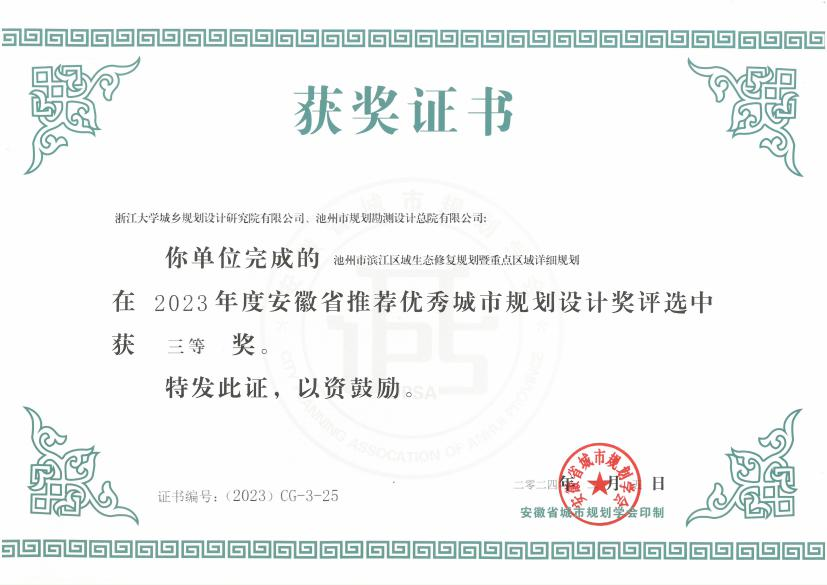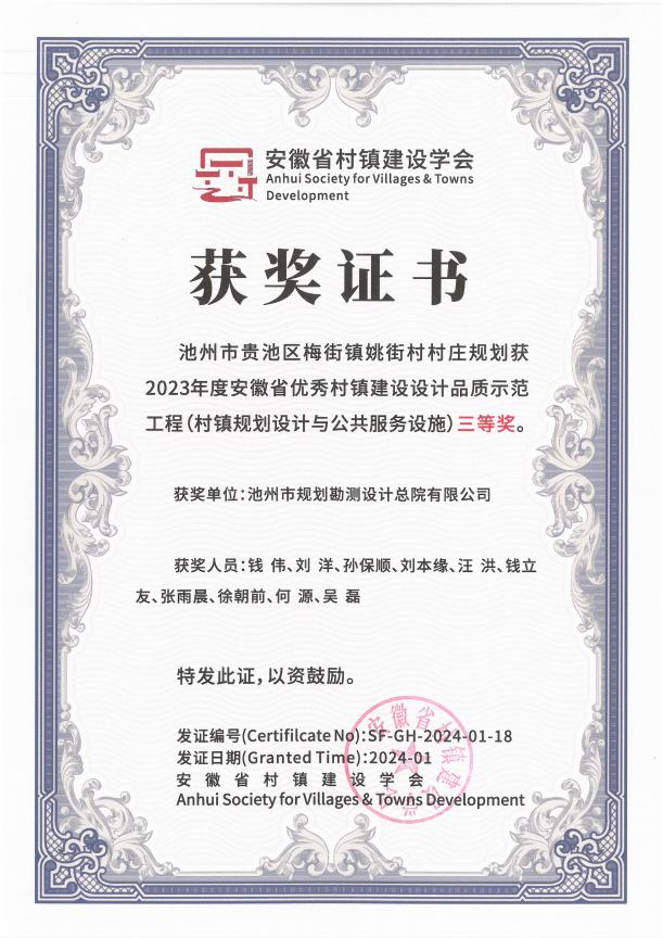 近日,安徽省村鎮(zhèn)建設學會和安徽省城市規(guī)劃學會分別揭曉了2023年度安徽省優(yōu)秀村鎮(zhèn)建設設計品質示范工程和2023年度安徽省推薦優(yōu)秀城市規(guī)劃設計獎的獲獎名單。由集團所屬設計總院公司編制完成的《池州市貴池區(qū)梅街鎮(zhèn)姚街村村莊規(guī)劃》和《池州市濱江區(qū)域生態(tài)修復規(guī)劃暨重點區(qū)域詳細規(guī)劃》兩個項目分別榮獲2023年度安徽省優(yōu)秀村鎮(zhèn)建設設計品質示范工程(村鎮(zhèn)規(guī)劃設計與公共服務設施)三等獎和2023年度安徽省推薦優(yōu)秀城市規(guī)劃設計獎三等獎。